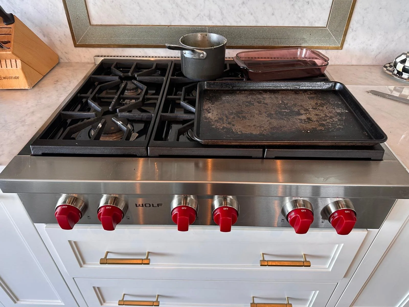 Dual-fuel ranges have two independent systems, and they fail independently. A dead oven with working burners almost always points to an electrical issue — a blown thermal fuse, a failed heating element, or a control board fault. We carry the most common components for Wolf dual-fuel models and can typically resolve this in a single visit.